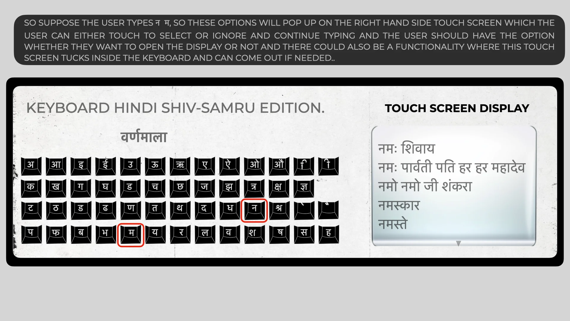 23RD JUNE 2025 LAST UPDATED 06:22 INDIAN STANDARD TIME: MYSELF SAMEER SINGAL HAVE JUST GOTTEN AN IDEA, SO THE IDEA IS FOR THE KEYBOARD, SO THERE WILL BE A TOUCH SCREEN ON THE RIGHT OF THE KEYBOARD WHICH WILL GIVE SUGGESTIONS FOR WORDS OR PHRASES TO COMPLETE SENTENCE AND THE USER CAN TOUCH IT TO CHOOSE TO COMPLETE THE WORD OR SENTENCE, SO SUPPOSE SOMEONE IS TYPING IN HINDI SO ON THE RIGHT SIDE OF THE KEYBOARD BESIDE THE GANIT(गणित) KEYS, THERE WILL BE A SCREEN OR THE SCREEN COULD BE ON THE LEFT RIGHT OR TOP TOO, AND THAT SCREEN WILL HELP THE USER IN TYPING. I WILL TRY TO PUT THE PHOTO OF WHAT MY SAMEER SINGAL IDEA IS EITHER BEFORE SLEEPING OR WHEN I WAKE UP IN THE AFTERNOON. PARMAATMAA SHIV SHANKAR MAHAKAAL IN SHIV LOK RIGHT NOW ORDERS THE GOVERNMENT OF INDIA TO LICENSE, COPYRIGHT, TRADEMARK AND PATENT THIS IDEA IMMEDIATELY AT THIS MOMENT NOW.