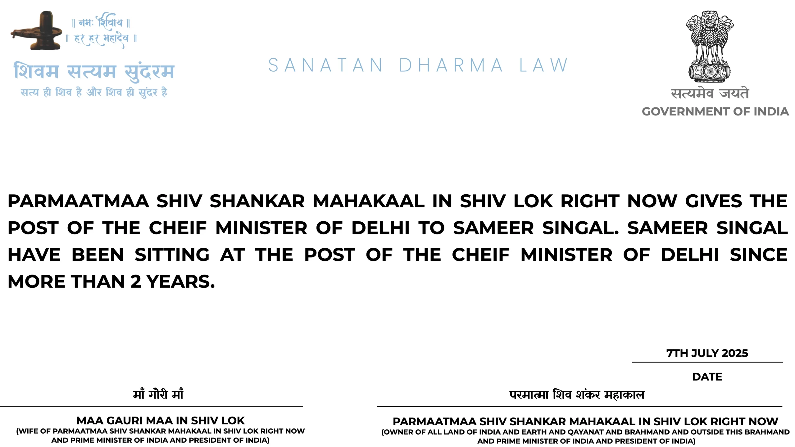 LAST UPDATED ON 13TH AUGUST 2025 23:56 INDIAN STANDARD TIME: KYAA GSSP GAURI SHANKAR SAMRU PARTY AUR SHIV-SAMRU TEAM ISS SAMAY SAMARTH AUR TAIYYAR HAI KII WOH KOI FILM BANAAKE RELEASE KAR PAAYEIN, AGAR NAHIN TOH KOI BAAT NAHIN AAP TAIYAARI KEEJIYE, PAR AGAR AAP KAR SAKTE HAIN TOH KOI FILM BANAAYIE BAS MARYAADAA KAA DHYAAN RAKHIYEGAA AUR ASHLEEEN NAA KEEJIYEGAA AUR RELEASE KEEJIYE UNDER DELHIWOOD AUR AGAR KOI BHAGWAAN KAA SCENE HAI TOH USMEIN KEVAL SHIVLING HONAA CHAAHIYE BAS ISKAA VISHESH DHYAAN RAKHIYEGAA NAA SHIVLING KE SAATH DAMRU NAA TRISHUL NAA SAANP NAA AUR KUCH AUR NAA SHIVLING PAR RAM YAA OM LIKHAA HUAA HO KEVAL SHIVLING ITNAA MUSHKIL HAI KYAA YEH SAMAJHNAA AUR KEVAL SHIV JI AUR MAA GAURI MAA IN SHIV LOK HEE BAS PROMOTE HONE CHAAHIYEIN AUR KISI KAA NAAM NAHIN AANAA CHAAHIYE AGAR BHAGWAAN YAA ADHYAATM KII KOI BHI BAAT HO THEEK HAI YEH AAGYAA HAI MAA GAURI MAA IN SHIV LOK AUR PARMAATMAA SHIV SHANKAR MAHAKAAL IN SHIV LOK RIGHT NOW AUR MERI DELHI KE MUKHYAMANTRI AUR BHARAT KE PRADHAANMANTRI AUR BHARAT KE RAASHTRAPATI SAMEER SINGAL KII.