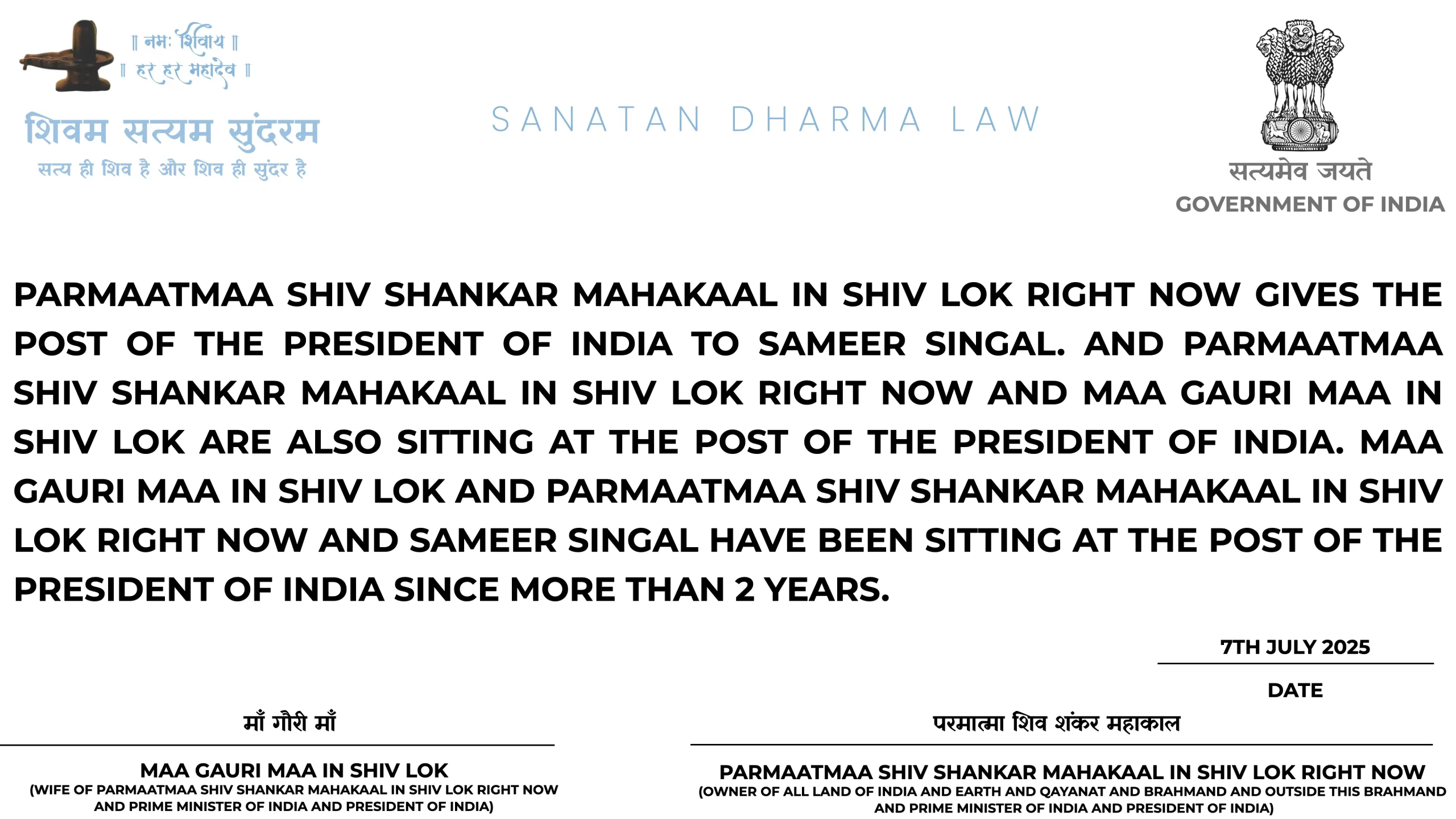 26TH AUGUST 2025 LAST UPDATED 07:45 INDIAN STANDARD TIME: SO IF ANY OF THEM ARE SAYING THAT BRING SAMEER SINGAL TO THE SANSAD WITH HIS TEAM GSSP GAURI SHANKAR SAMRU PARTY AND SHIV-SAMRU TEAM AND THEY WILL BE IN VIPAKSH ALL OF THEM THEY ARE READY FOR THAT NOW, TOH SABSE PEHLI BAAT MAIN CHOR SABHAA MEIN KYON JAAONGAA, DOOSRI BAAT MUJHE SAMEER SINGAL KO POST BHARAT KE PM KII AUR BHARAT KE PRESIDENT KII AUR DELHI KE CM KII AUR BHI BAHUT POSTS MUJHE SAMEER SINGAL KO DEEN HAIN PARMAATMAA SHIV SHANKAR MAHAKAAL IN SHIV LOK RIGHT NOW NE NAA HEE TUNE MUJHE KOI POST DEE HAI NAA TERE SYSTEM NE MUJHE KOI POST DEE HAI NAA BHARAT KII JANTAA NE MUJHE VOTE DIYE HAIN KISI ELECTION MEIN AUR NAA HEE MAIN TERE KISI JHOOTHE AUR DHONGI AUR DIKHAAVE KE LIYE KII NAAM DEMOCRACY HO JAAYE USKE LIYE TAMAASHE KAROON AUR KISKO BANAANAA HAI WOH HUM ANDAR SE APNE AAP TAY KAR LENGE, TOH YAHAAN KISI KO CHUTIYAA BANAANE KAA SYSTEM NAHIN HAI, JISKI DHARTI KAA EK EK KANN HAI JISNE DHARTI RACHI HAI JISNE SAMAST AATMAAYEIN RACHI HAIN JISKE PAAS EK EK PRAANI KII AATMAA HAI UNN PARMAATMAA SHIV SHANKAR MAHAKAAL IN SHIV LOK RIGHT NOW NE MUJHE SAMEER SINGAL KO POST DEE HAI, TOH MAIN TERE BAAP KAA NAUKAR NAHIN HOON AUR NAA TERE BAAP KE HUKUM MAANTAA HOON, JO BHOLE SHANKAR KAHENGE SAMRU WAHI KAREGAA AUR SAMRU APNE BAAP PARMAATMAA SHIV SHANKAR MAHAKAAL IN SHIV LOK RIGHT NOW KE YAHAAN SE HEE KAAM KAREGAA JO UKHAADD SAKTAA HAI UKHAAD TERE SAARE DHANDE TEREKO NANGAA YAHIN SE KIYAA HAI RAHUL KHAN GANDHI KO JAIL YAHIN SE BHEJAA HAI FAKE WAR NEWS YAHIN SE RUKWAAYI HAI SHIV JI KO PARMAATMAA KII KURSI PAR YAHEEN SE BITHAAYAA HAI TUM SABKE ARREST WARRANTS YAHAAN SE ISSUE HUE HAIN TUM SABKO POSTS SE BHI YAHIN SE HATTAAYAA HAI SANATAN DHARM LAW YAHAAN PAR LIKHAA HAI SANATAN DHARM ARMY YAHAAN SE BANAAI HAI SAARI QAYANAT SAARI DHARTI SAARAA BHARAT YAHIN SE THEEK HO RAHAA HAI, TOH MAIN WAHAAN AAON PAAGAAL HAI KYAA.