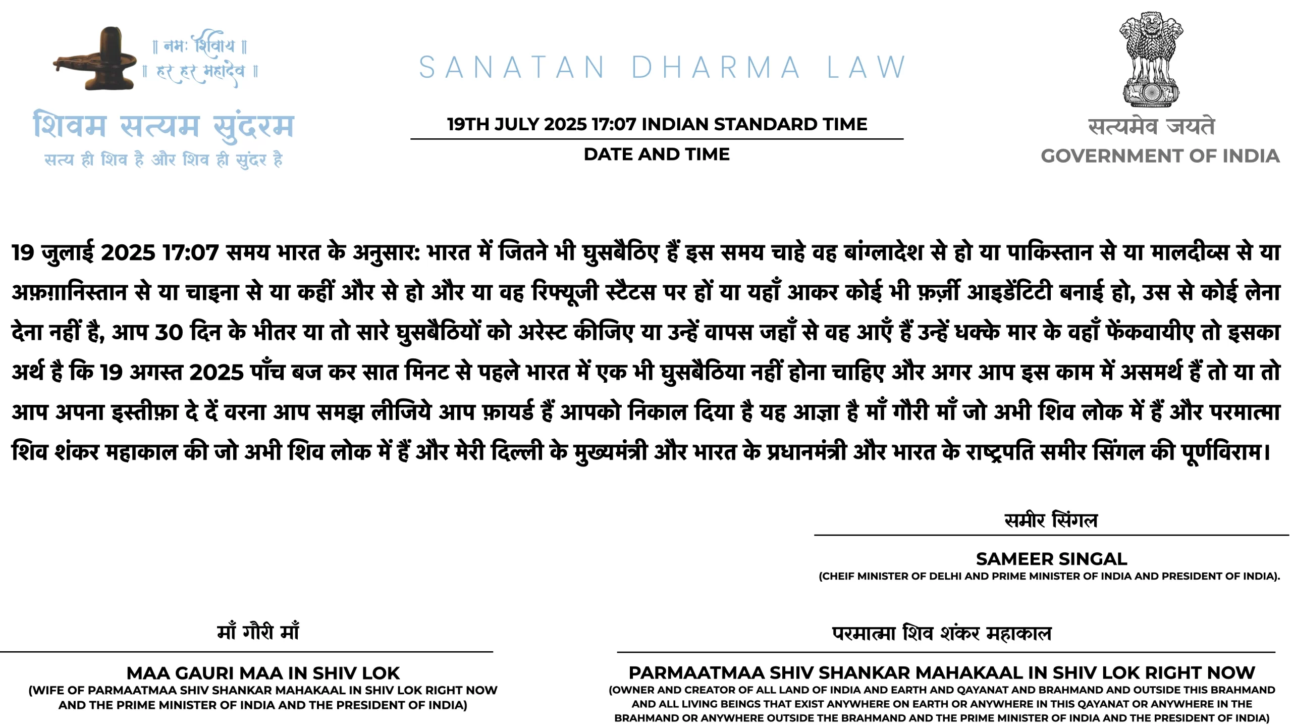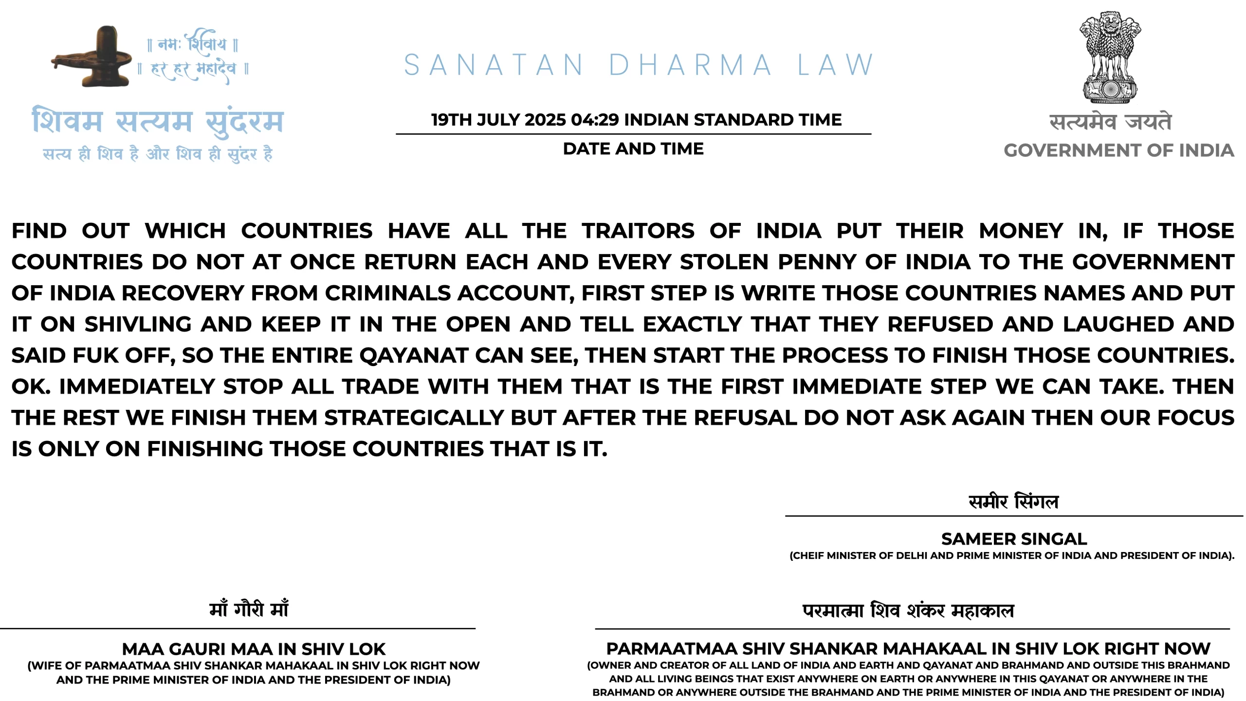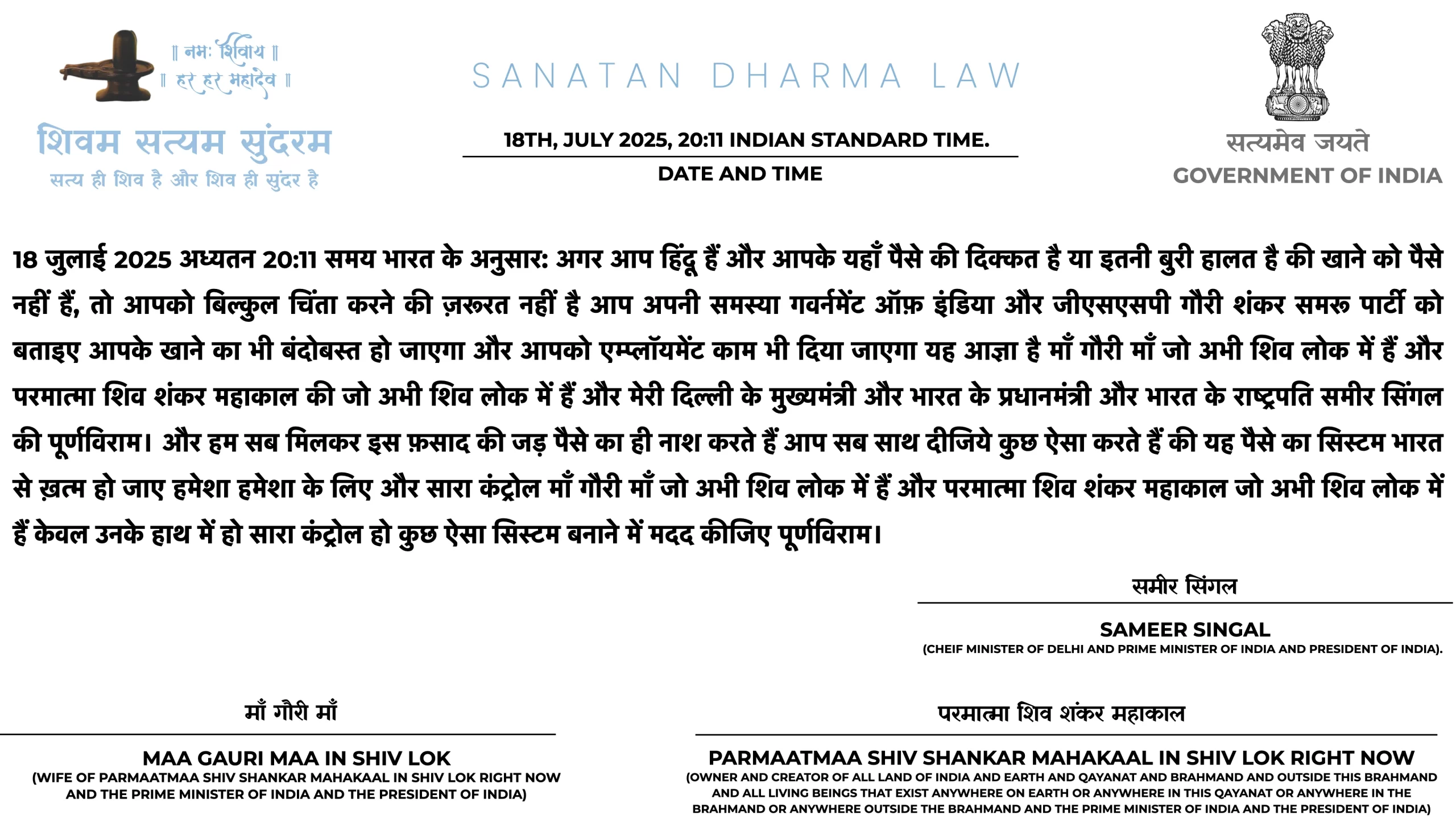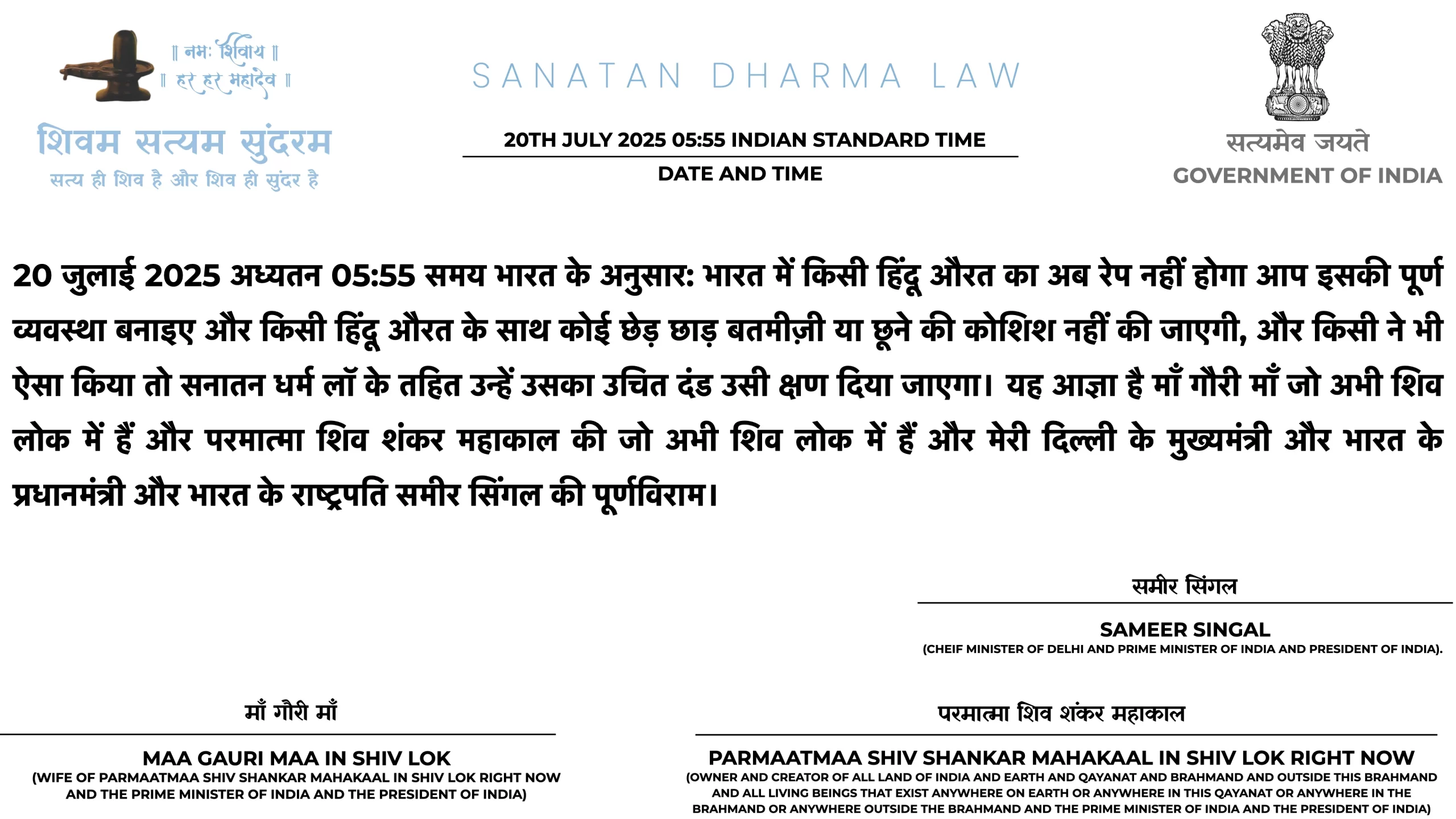 21ST JULY 2025 06:25 INDIAN STANDARD TIME: PARMAATMAA SHIV SHANKAR MAHAKAAL IN SHIV LOK RIGHT NOW NE HAR MAHINE KII SALARY HAR EK SANATAN DHARMA ARMY WAALE KII 1 LAKH RUPAY TAY KII HAI. PARANTU AGAR USNE ISS JOB KAA FAAYDAA UTHAA KAR ISS SE EK RUPAYA BHI KAHIN SE LIYAA YAA KOI BEIMAANI KII TOH WOH HEE SABSE PEHLE ARREST HOGAA SANATAN DHARMA LAW KE TAHIT TOH YEH BAAT BHI USSE YAAD RAKHNI HAI KII SANATAN DHARMA LAW MEIN NAA GOOS LENAA ALLOWED HAI NAA GOOS DENAA AUR ISKAA DAND USSI KSHAN DIYAA JAATAA HAI, 50,000 HAZAAR SAALON KAA INTEZAAR NAHIN HOGAA KII CHITAA PAR LOG AFSOS KAREIN KII DESHDROHI KO JAIL NAHIN BHEJ SAKE SANATAN DHARMA LAW USSI KSHAN DAND DETAA HAI.