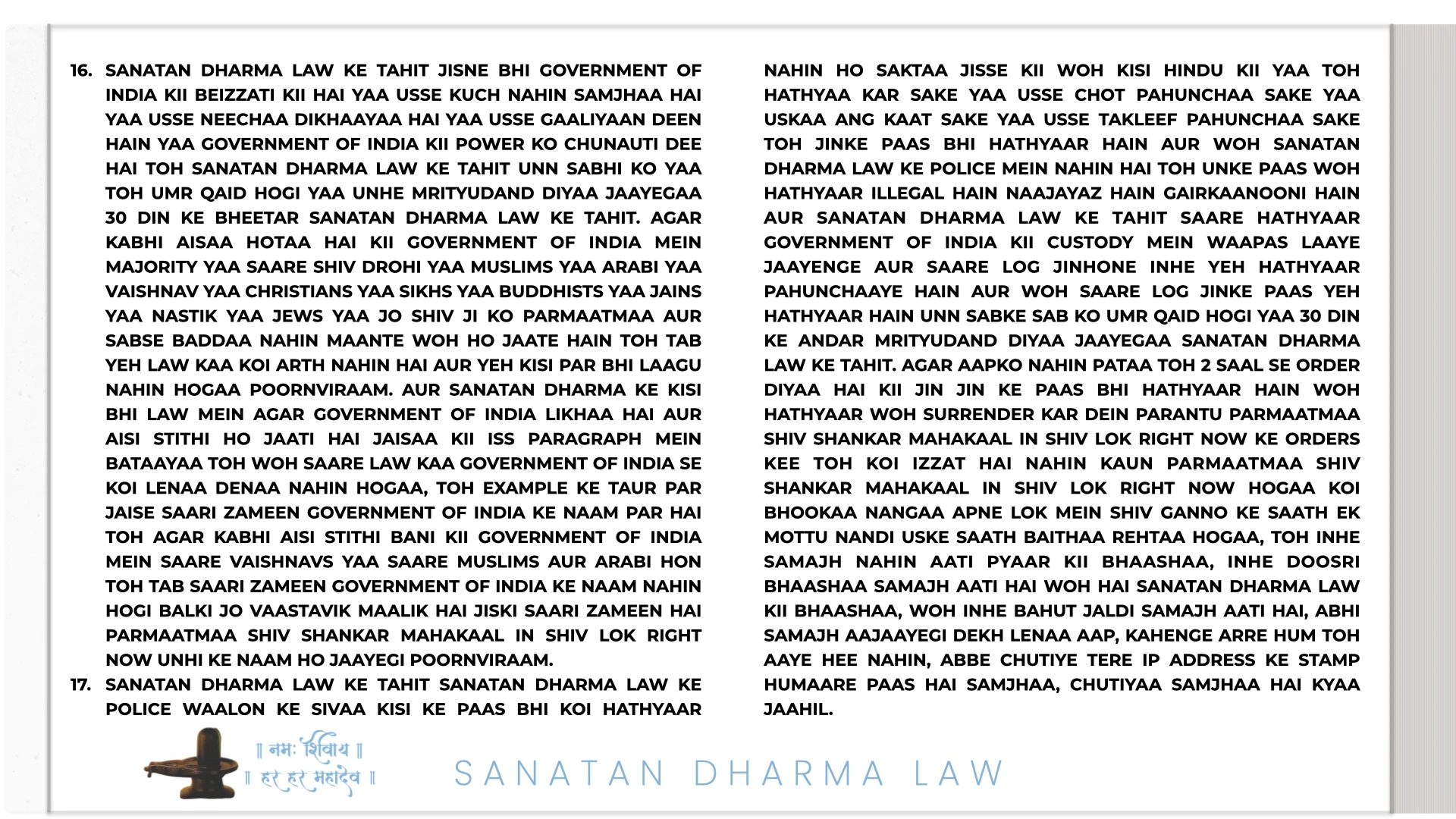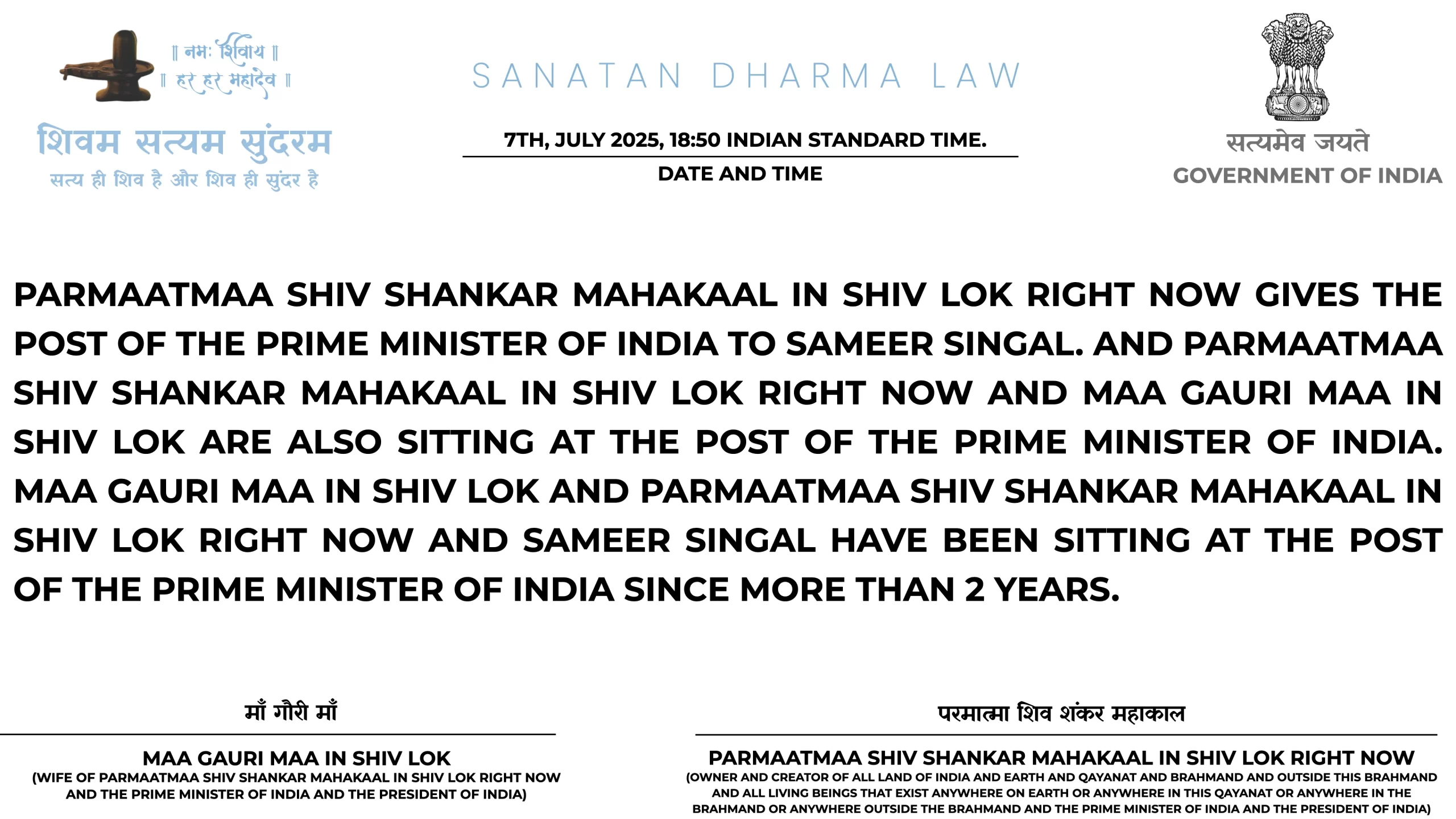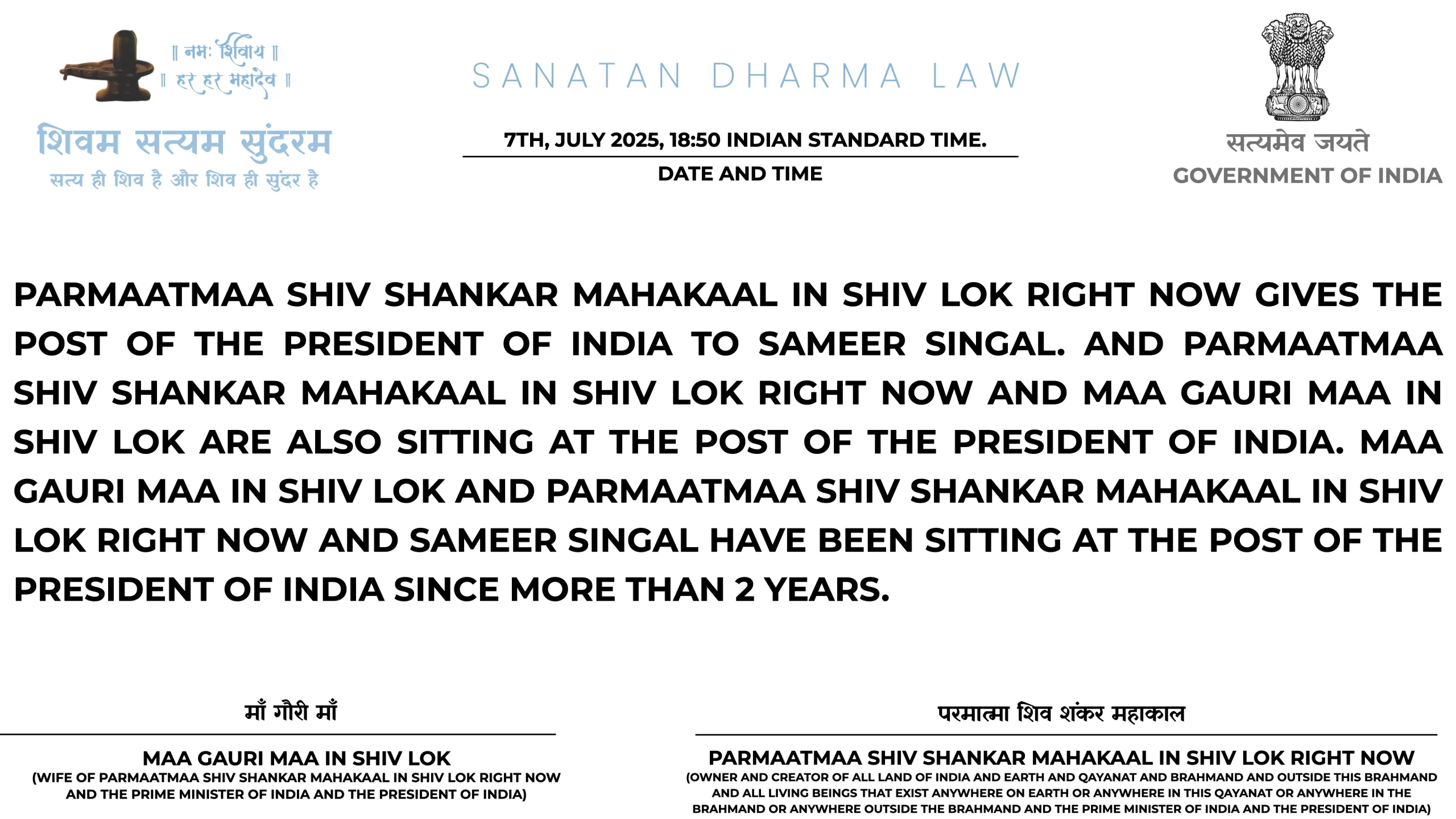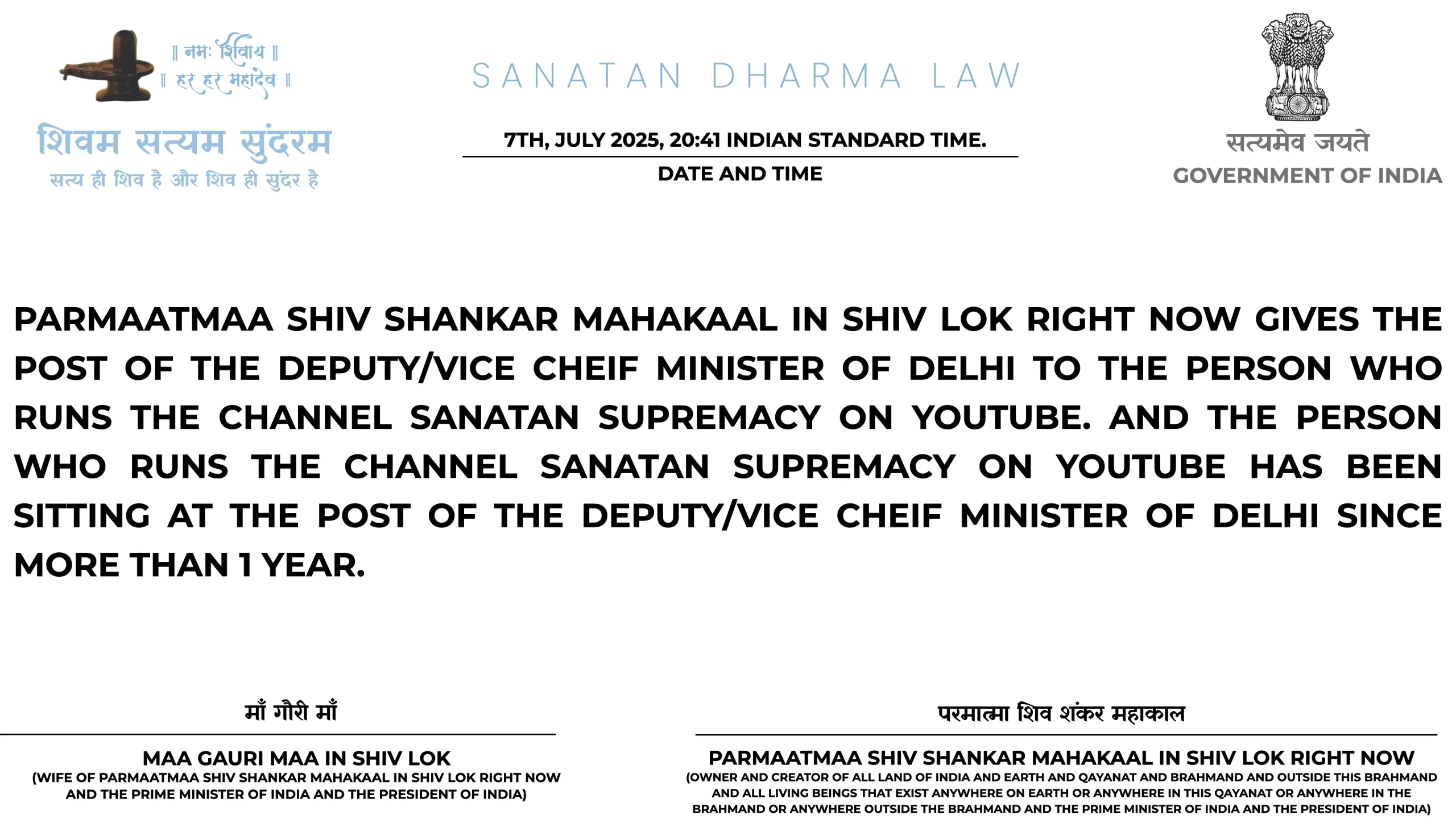 21ST JULY 2025 06:25 INDIAN STANDARD TIME: PARMAATMAA SHIV SHANKAR MAHAKAAL IN SHIV LOK RIGHT NOW NE HAR MAHINE KII SALARY HAR EK SANATAN DHARMA ARMY WAALE KII 1 LAKH RUPAY TAY KII HAI. PARANTU AGAR USNE ISS JOB KAA FAAYDAA UTHAA KAR ISS SE EK RUPAYA BHI KAHIN SE LIYAA YAA KOI BEIMAANI KII TOH WOH HEE SABSE PEHLE ARREST HOGAA SANATAN DHARMA LAW KE TAHIT TOH YEH BAAT BHI USSE YAAD RAKHNI HAI KII SANATAN DHARMA LAW MEIN NAA GOOS LENAA ALLOWED HAI NAA GOOS DENAA AUR ISKAA DAND USSI KSHAN DIYAA JAATAA HAI, 50,000 HAZAAR SAALON KAA INTEZAAR NAHIN HOGAA KII CHITAA PAR LOG AFSOS KAREIN KII DESHDROHI KO JAIL NAHIN BHEJ SAKE SANATAN DHARMA LAW USSI KSHAN DAND DETAA HAI.