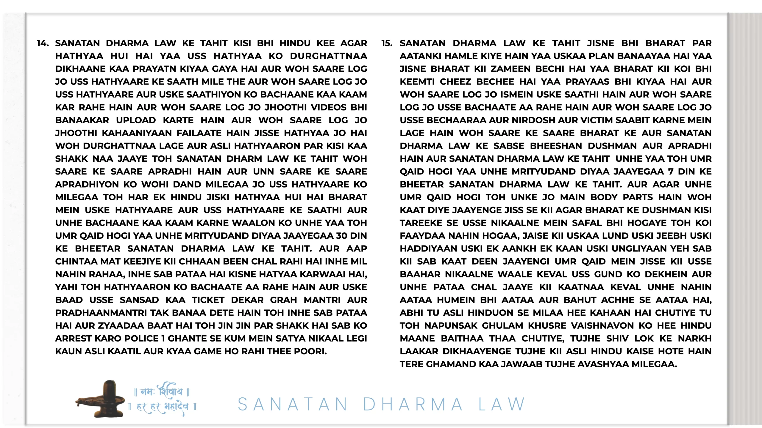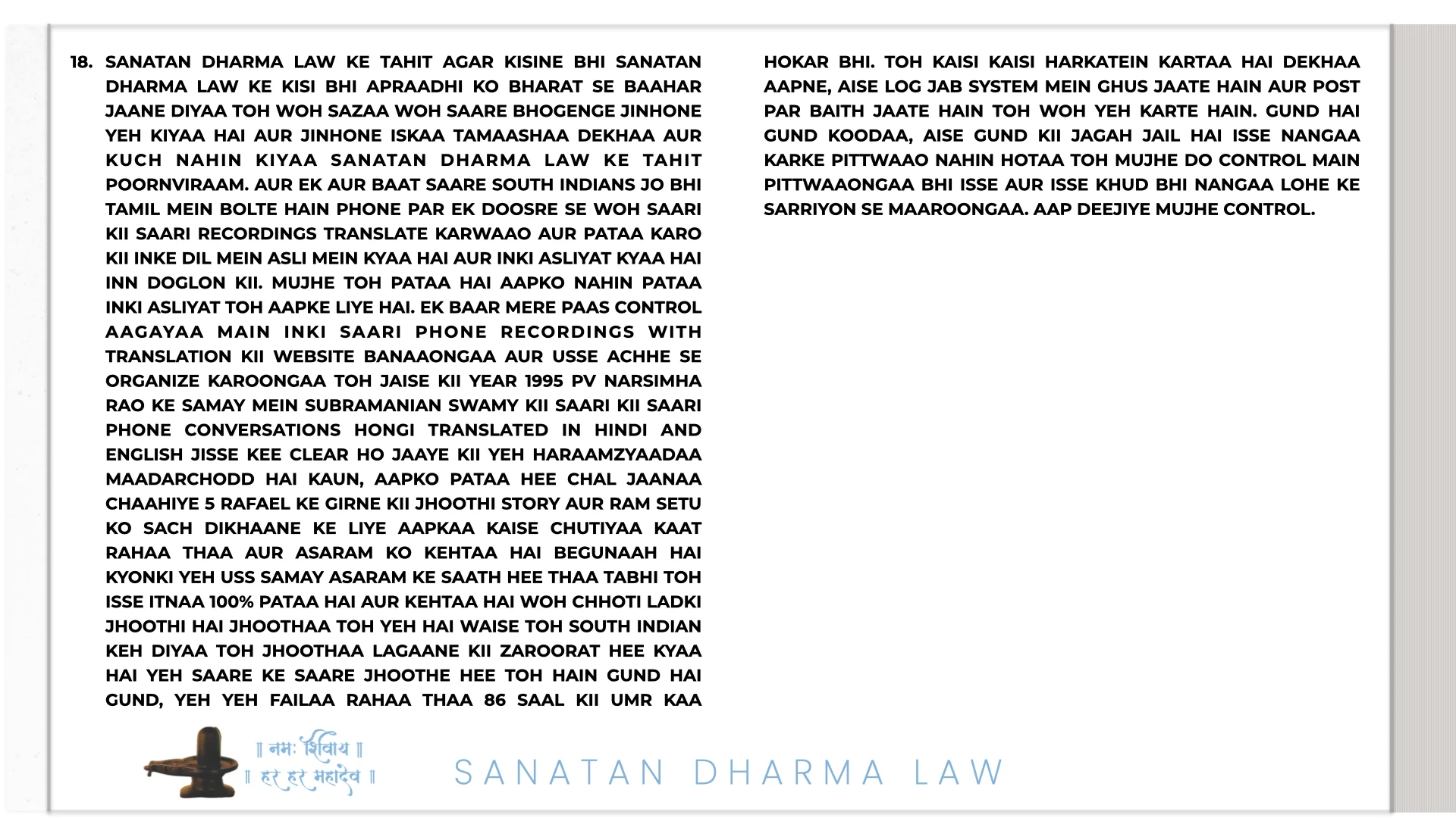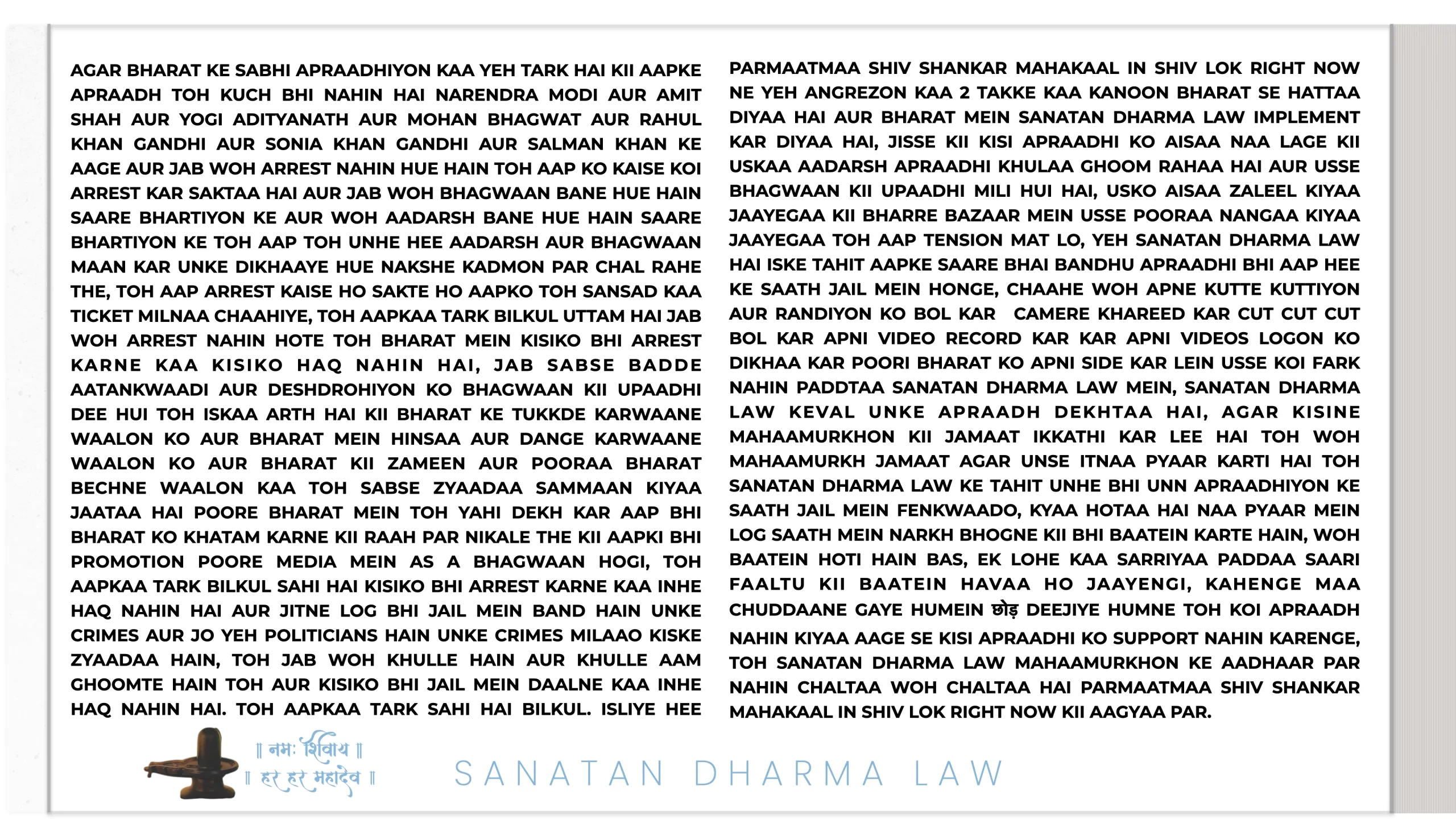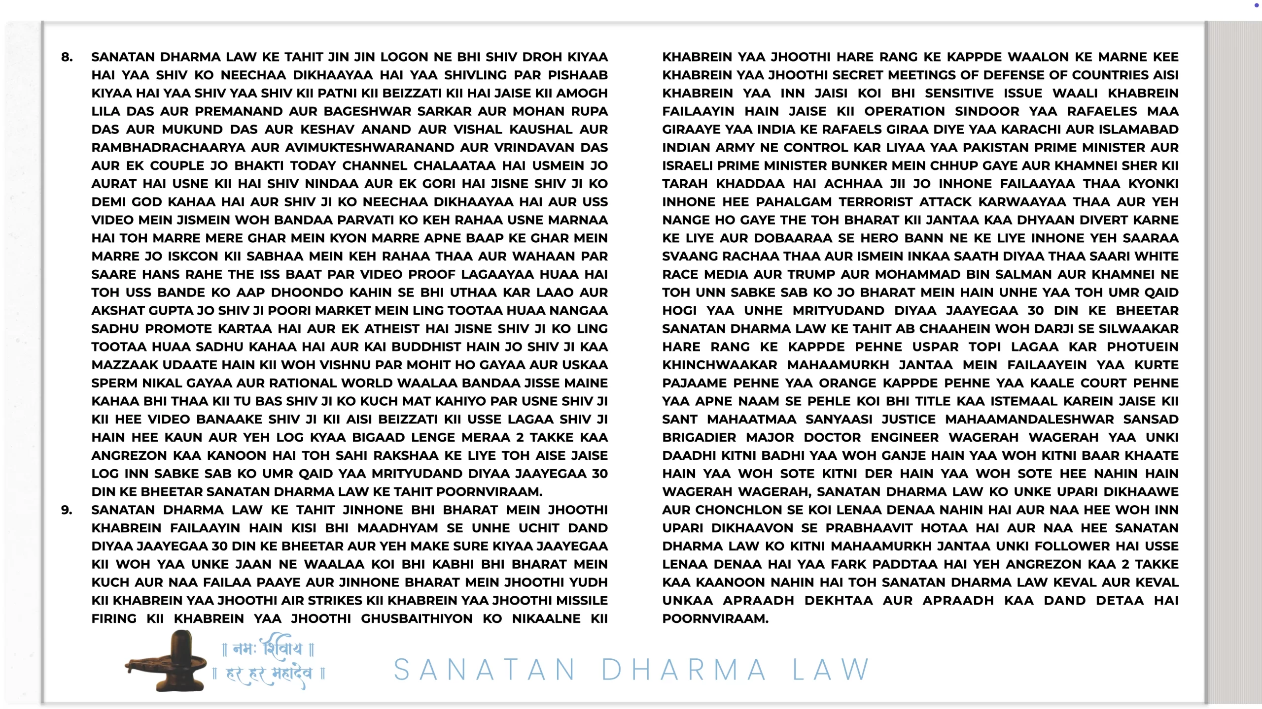 21ST JULY 2025 06:25 INDIAN STANDARD TIME: PARMAATMAA SHIV SHANKAR MAHAKAAL IN SHIV LOK RIGHT NOW NE HAR MAHINE KII SALARY HAR EK SANATAN DHARMA ARMY WAALE KII 1 LAKH RUPAY TAY KII HAI. PARANTU AGAR USNE ISS JOB KAA FAAYDAA UTHAA KAR ISS SE EK RUPAYA BHI KAHIN SE LIYAA YAA KOI BEIMAANI KII TOH WOH HEE SABSE PEHLE ARREST HOGAA SANATAN DHARMA LAW KE TAHIT TOH YEH BAAT BHI USSE YAAD RAKHNI HAI KII SANATAN DHARMA LAW MEIN NAA GOOS LENAA ALLOWED HAI NAA GOOS DENAA AUR ISKAA DAND USSI KSHAN DIYAA JAATAA HAI, 50,000 HAZAAR SAALON KAA INTEZAAR NAHIN HOGAA KII CHITAA PAR LOG AFSOS KAREIN KII DESHDROHI KO JAIL NAHIN BHEJ SAKE SANATAN DHARMA LAW USSI KSHAN DAND DETAA HAI.