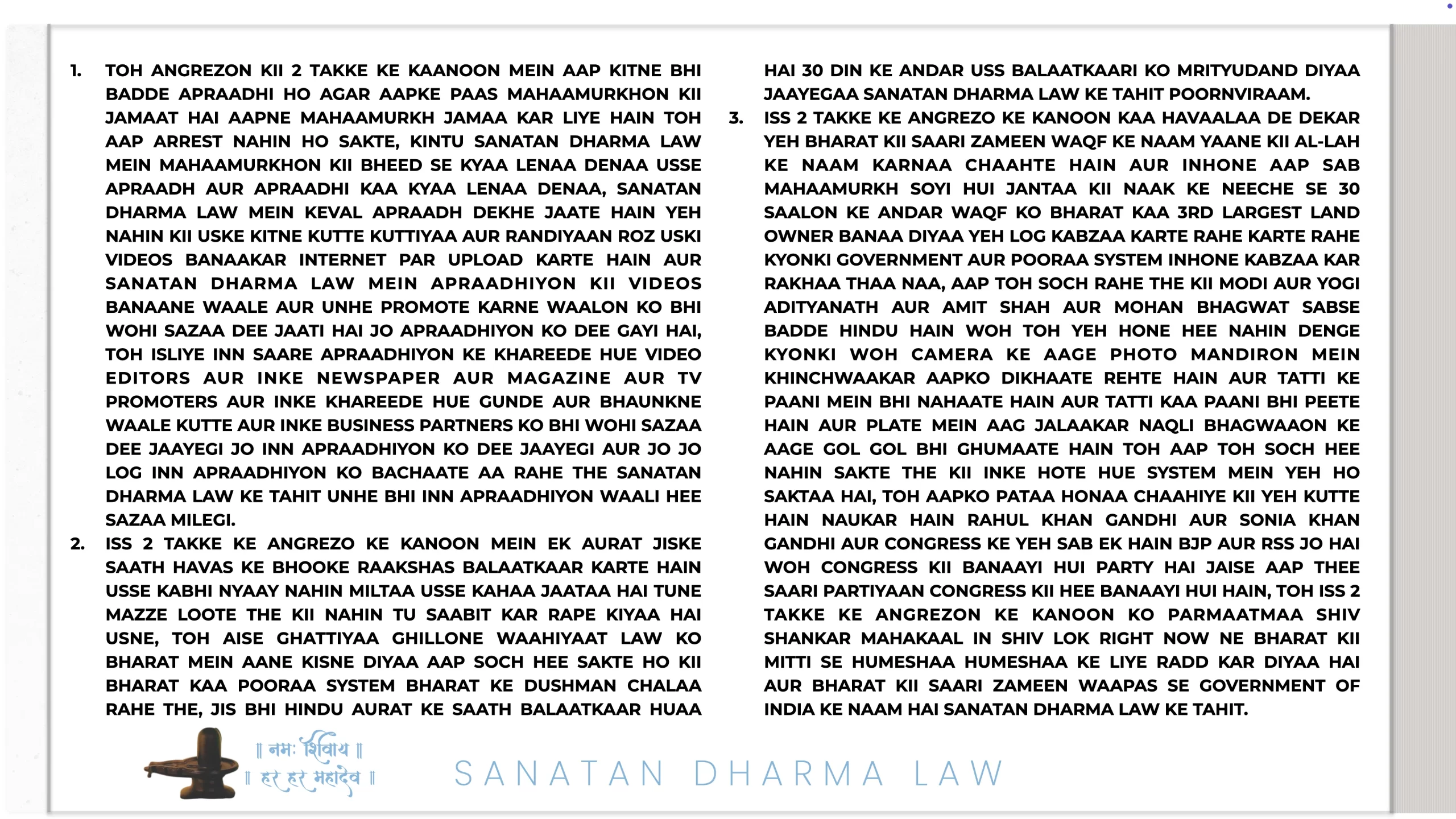 LAST UPDATED ON 21ST JULY 2025 22:06 INDIAN STANDARD TIME: TOH SANATAN DHARMA ARMY MEIN JO BHARTI HONGE UNKAA KARTAVYA AUR DHARMA KYAA HAI, TOH SANATAN DHARMA ARMY WAALON KAA PRATHAM AUR ANTIM DHARM EK HEE HAI KII PARMAATMAA SHIV SHANKAR MAHAKAAL IN SHIV LOK RIGHT NOW AUR MAA GAURI MAA IN SHIV LOK KII SABHI AAGYAAON KO SAMPANN KARNAA. SANATAN DHARMA ARMY WAALON KAA KARTAVYA HAI KII BHARAT MEIN KISI HINDU PAR ATYAACHAAR NAA HONE DENAA. SANATAN DHARMA ARMY WAALON KAA KARTAVYA YEH HAI KII BHARAT MEIN KISI HINDU AURAT KAA RAPE NAA HONE DENAA AUR KISI HINDU AURAT PAR KISI BHI PRAKAAR KAA ATYAACHAAR NAA HONE DENAA ISKAA SABSE ZYAADAA KHAYAAL RAKHNAA. SANATAN DHARMA ARMY WAALON KAA KARTAVYA HAI KII BHARAT KII ZAMEEN JO ABHI GOVERNMENT OF INDIA KE NAAM HAI AGAR KABHI AISI STITHI BANTI HAI KII GOVERNMENT OF INDIA MEIN MAJORITY VAISHNAVS YAA MUSLIMS AUR ARABI YAA CHRISTIANS YAA SIKHS YAA JEWS YAA ATHEISTS YAA BUDDHISTS YAA JAINS YAA KOI BHI AISE LOG HOTE HAIN JO PARMAATMAA SHIV SHANKAR MAHAKAAL IN SHIV LOK RIGHT NOW KO SABSE UPAR AUR RACHETAA AUR PARMAATMAA NAHIN MAANTE TOH BHARAT KII ZAMEEN WAAPAS SE KEVAL PARMAATMAA SHIV SHANKAR MAHAKAAL IN SHIV LOK RIGHT NOW KE NAAM KAR DENI. SANATAN DHARMA ARMY WAALON KAA KARTAVYA YEH HAI KII BHARAT MEIN KISI BHI GHUSBAITHIYE KO GHUSNE NAA DEIN AUR JO GHUS CHUKE HAIN UNHE NIKAAL KE FENKE JALD SE JALD. SANATAN DHARMA ARMY WAALON KAA KARTAVYA YEH HAI KII BHARAT MEIN KOI BHI AATANKI HUMLAA NAA HONE DEIN. SANATAN DHARMA ARMY WAALON KAA KARTAVYA YEH HAI KII BHARAT KO SABSE SHAKTISHAALI DESH BANAAYEIN. SANATAN DHARMA ARMY WAALON KAA KARTAVYA YEH HAI KII SABHI DESH DROHIYON AUR GADDAARON AUR DESH KII ZAMEEN TAK BECHNE WAALON KO AUR DESH BECHNE WAALON KO JAIL MEIN FENKE AUR UCHIT DAND DEIN. SANATAN DHARMA ARMY WAALON KAA KARTAVYA YEH HAI KII BHARAT MEIN SANATAN DHARMA KO KHATAM KARNE WAALE LOGON KAA NAASH KAR DEIN. SANATAN DHARMA ARMY WAALON KAA KARTAVYA YEH HAI KII HINDUON KO CONVERT KARNE WAALE LOGON KO JAIL MEIN FENKE. SANATAN DHARMA ARMY WAALON KAA KARTAVYA YEH HAI KII SANATAN DHARMA KO BECHNE WAALE LOG YAA SANATAN DHARMA KAA MAZZAAK BANAANE WAALE LOG YAA PARMAATMAA SHIV SHANKAR MAHAKAAL IN SHIV LOK RIGHT NOW YAA MAA GAURI MAA IN SHIV LOK KAA MAZZAAK YAA BEIZZATI KARNE WAALE LOGON KO JAIL MEIN FENKE. SANATAN DHARMA ARMY WAALON KAA KARTAVYA YEH HAI KII WOH BHARAT KO HINDU RASHTRA BANAAYE RAKHEIN HUMESHAA. SANATAN DHARMA ARMY WAALON KAA YEH KARTAVYA HAI KII SABHI HINDUON KO NYAAY MILE WOH BHI TURANT. SANATAN DHARMA ARMY WAALON KAA KARTAVYA HAI KII SANATAN DHARMA KO GEHRAAI SE SAMAJHNAA AUR SANATAN DHARMA AUR VAISHNAVISM YAA VEDIC BELEIF SYSTEM YAA BRAHMANWAAD YAA JAAT PAAT KAA SYSTEM YAA NAARI KO NARKH KAA DWAARAA WAALE SYSTEM MEIN JO BHEDD HAI USSE SAMAJHNA AUR DONO KO MIX NAHIN HONE DENAA AUR KISI BHI VAISHNAV KO “SANATAN DHARMA” SHABD KAA PRAYOG KARKE USKAA LAABH NAA LENE DENAA AUR SABHI NAQLI BHAGWAANO KII NAQLI KITAABON KE SYSTEM KO GEHRAAI SE SAMAJHNAA JISSE UNKE MAAN NE WAALON KII MAANSIKTAA BHALI BHAANTI SAMAJH AA SAKE. SANATAN DHARMA ARMY WAALON KAA KARTAVYA HAI KII SABHI SHIV MANDIRON SIVAAY SHIVLING KE AUR NAA KOI TASVEER HO NAA KOI STATUE HO AUR NAA WAHAAN KOI VAISHNAV PONGAA PANDIT APNI DUKAAN KHOLKE BAITHAA HO KII WOH SHIVLING PAR COLORING KARTAA RAHEGAA POORAA DIN BAS SHIVLING USKE KABZE MEIN RAHEGAA AUR WOH WAHAAN KAA BOSS BAN JAAYEGAA YEH HAI DEAL TOH AISAA NAHIN HONE DENAA PARMAATMAA SHIV SHANKAR MAHAAKAL IN SHIV LOK RIGHT NOW APNE SABHI MANDIRON KAA KHAYAL SVAYAM RAKHENGE AUR HAR SHIV MANDIR KE BOSS KEVAL PARMAATMAA SHIV SHANKAR MAHAKAAL IN SHIV LOK RIGHT NOW HEE HON ISKAA AAPKO KHAYAAL RAKHNAA HAI AUR AAP BAS PARMAATMAA SHIV SHANKAR MAHAKAAL IN SHIV LOK RIGHT NOW KII AAGYAA KAA PAALAN KEEJIYE. SANATAN DHARMA ARMY WAALON KAA KARTAVYA HAI KII BHARAT MEIN AGAR KOI BHI KITAAB AISI BIKK RAHI HAI YAA PADHAAI JAA RAHI HAI JISMEIN SHIV JI YAA UNKI PATNI MAA GAURI MAA IN SHIV LOK KII BEIZZATI HAI TOH YAA TOH USS KITAAB MEIN SE WOH PANKTIYAAN HATTAAIN JAAYEIN YAA WOH KITAABEIN MARKET MEIN BIKKNE NAHIN DENI AUR KISI TAK PAHUNCHNE NAHIN DENI, ISS SAMPOORN DHARTI KAA ISS SAMPOORN SRISHTI KAA ISS SAMPOORN BRAHMAND KAA ISS SAMPOORN QAYANAT KAA RACHETAA ISS DHARTI KAA ISS QAYANAT KAA ISS BRAHMAND KAA ASLI MAALIK JISKE PAAS EK EK PRAANI KII AATMAA HAI CHAAHE WOH DHARTI PAR HO YAA ISS QAYANAT MEIN KAHIN BHI YAA ISS BRAHMAND MEIN KAHIN BHI YAA BRAHMAND SE BAAHAR KAHIN BHI WOH PARMAATMAA SHIV SHANKAR MAHAKAAL IN SHIV LOK RIGHT NOW HAIN AUR UNKAA DHARTI PAR EK HEE CHIHN HAI WOH HAI SHIVLING YEHI HAI SAMPOORN SATYA ISKE UPAR KOI SATYA NAHIN HAI JO ISS SE BHINN KUCH BATAAYE TOH AAP SAMAJH LEEJIYE KII USKAA PAALAN KARNE SE AAPKI AATMAA KII YATRA SAMAAPT HO JAAYEGI AUR AAP SHIV LOK KE NARKH MEIN SADDOGE TOH AISI KITAABON YAA TEXT KAA PRACHAAR BILKUL NAA HONE DENAA YEH HAI KARTAVYA SANATAN DHARMA ARMY WAALON KAA. SANATAN DHARMA ARMY WAALON KAA KARTAVYA HAI KII SHIV MANDIR MEIN KEVAL SHIVLING HO KEVAL KAA ARTH HAI KEVAL, KEVAL MEIN APNE AAP SE KISI GAAY KII MURTI YAA DAMRU YAA TRISHUL MAT LAGAA LENAA KII BHEED AAP PAR PRESSURE DAAL RAHI HAI TOH AAPNE WOH KARNAA SHURU KAR DIYAA, BHEED SE PRABHAAVIT NAHIN HONAA HAI WOH PROGRAMMED BHEED HAI GARBAGE HAI CHUTIYE HAIN THEEK HAI DEKH LIYAA AAPNE KII EK VIDEO SE KAISE USS BHEED KII DISHAA MODDI JAA RAHI THEE ISS CHORON KE TANTRA DWAARAA, TOH KEVAL SHIVLING HONAA CHAAHIYE SHIV MANDIR MEIN BAS AUR KEVAL JAL AUR DOODH KII VYAVASHTAA HO BAS, AUR SHIVLING PAR KUCH BHI LIKHNAA NISHEDH HAI TOH AGAR KOI NAA MAANE AUR RAM YAA OM LIKHE YAA AUR KUCH LIKHE TOH USSE KABHI BHI KISI SHIV MANDIR MEIN KABHI BHI ENTRY NAA DEE JAAYE ISKAA POORAA DHYAAN RAKHNAA HAI WOH PAAKHANDI VAISHNAV HAI JO SHIVLING SE PUNYA CHORI KARNE AAYAA HAI JO SHIV KO DAS SAMAJHTAA HAI ANDAR SE VISHNU KAA AUR SHIV KO TAMSIK LING TOOTAA HUAA NANGAA NAACHNE WAALAA KHUSRAA SAMAJHTAA HAI ANDAR SE, TOH AISE LOGON KO AGAR AAPNE SHIVLING SE PUNYA CHORI KARNE DIYAA TOH DAND AAP BHI BHOGOGE TOH AAPKO DHYAAN RAKHNAA HAI HAR CHOTI BAAT KAA AAP PARMAATMAA SHIV SHANKAR MAHAKAAL IN S
