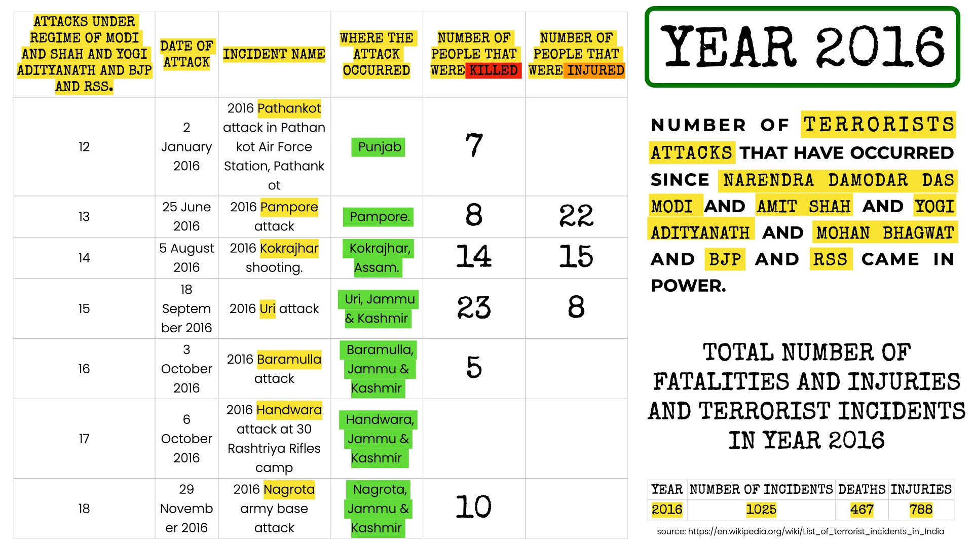 1025 TERRORIST INCIDENTS THAT TOOK PLACE IN 2016 UNDER THE REGIME OF MODI AND SHAH AND YOGI ADITYANATH AND MOHAN BHAGWAT AND BJP AND RSS.