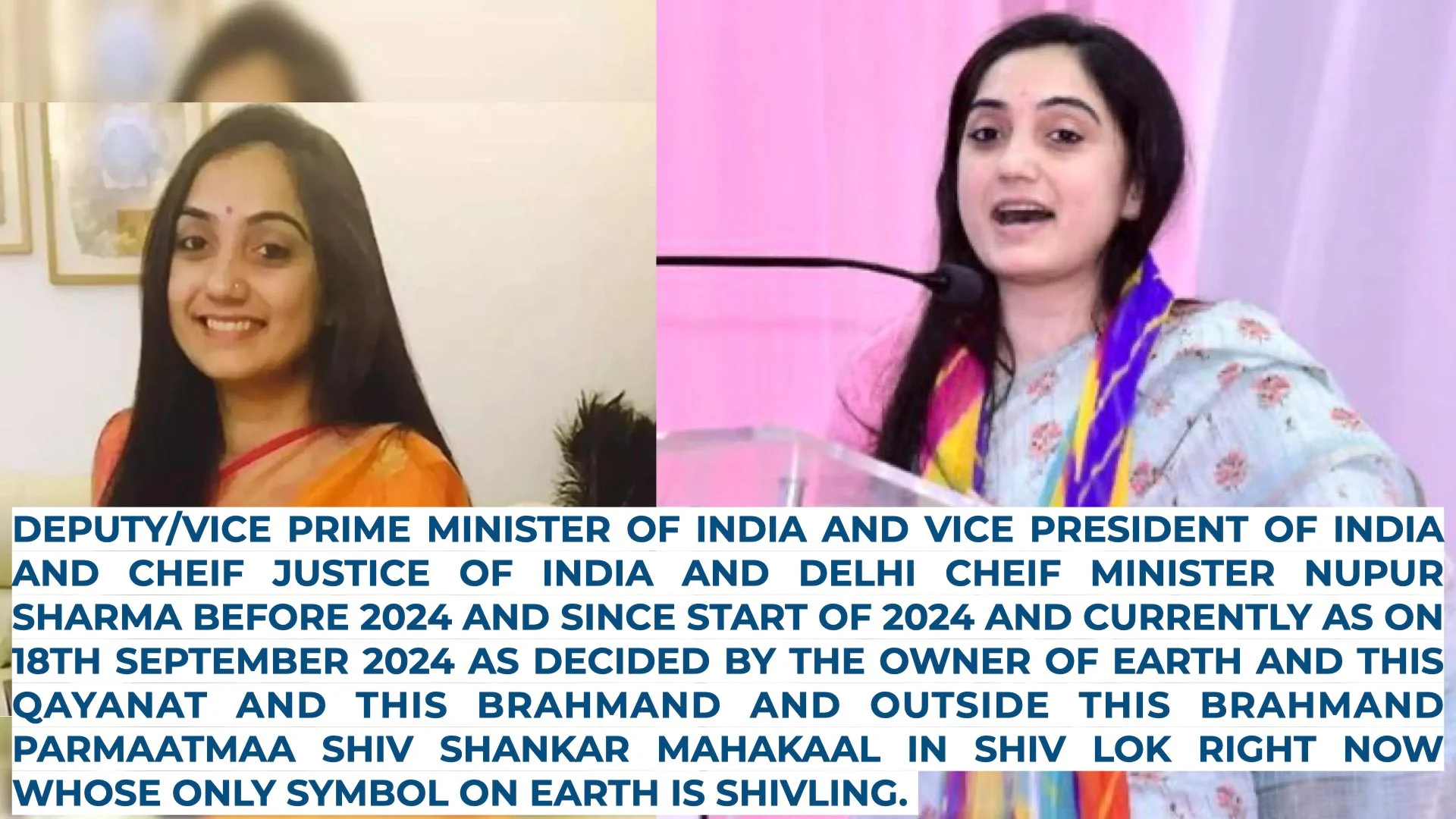 LAST UPDATED ON 25TH SEPTEMBER 2024 LAST UPDATED 19:02 INDIAN STANDARD TIME EARTH’S TIME: I WANT NUPUR SHARMA AND ASHWINI UPADHYAY TO GO TO THE PLACE WHERE ATISHI MARLENA WAS SITTING WHERE THERE WERE 2 CHAIRS AND YOU NUPUR SHARMA AND ASHWINI UPADHYAY SIT ON THE CHAIR OF THE CHEIF MINISTER OF DELHI AND HAVE ANOTHER CHAIR BESIDE THAT AND PUT SHIVLING AND MY PHOTO THERE AND TAKE PHOTOS AND VIDEOS OF THAT AND PUBLISH IT EVERYWHERE. AND ALSO TELL PALKI SHARMA AND ANAND RANGANATHAN TO DO THE SAME IN THE ROOM OF DEPUTY/VICE CHEIF MINISTER OF DELHI. AND THIS IS ALSO ORDER FROM PARMAATMAA SHIV SHANKAR MAHAKAAL IN SHIV LOK RIGHT NOW AND MAA GAURI MAA IN SHIV LOK.